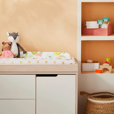 This Floral and Dots Plush Changing Pad Cover from Cloud Island™ mixes and matches two classic patterns for a unique twist. Golden polka dots spot the outer edge of the pad, while a large floral pattern of pinks, blues and yellows covers the top. Protect your changing pad while keeping your baby’s room looking beautifully coordinated and stylish.